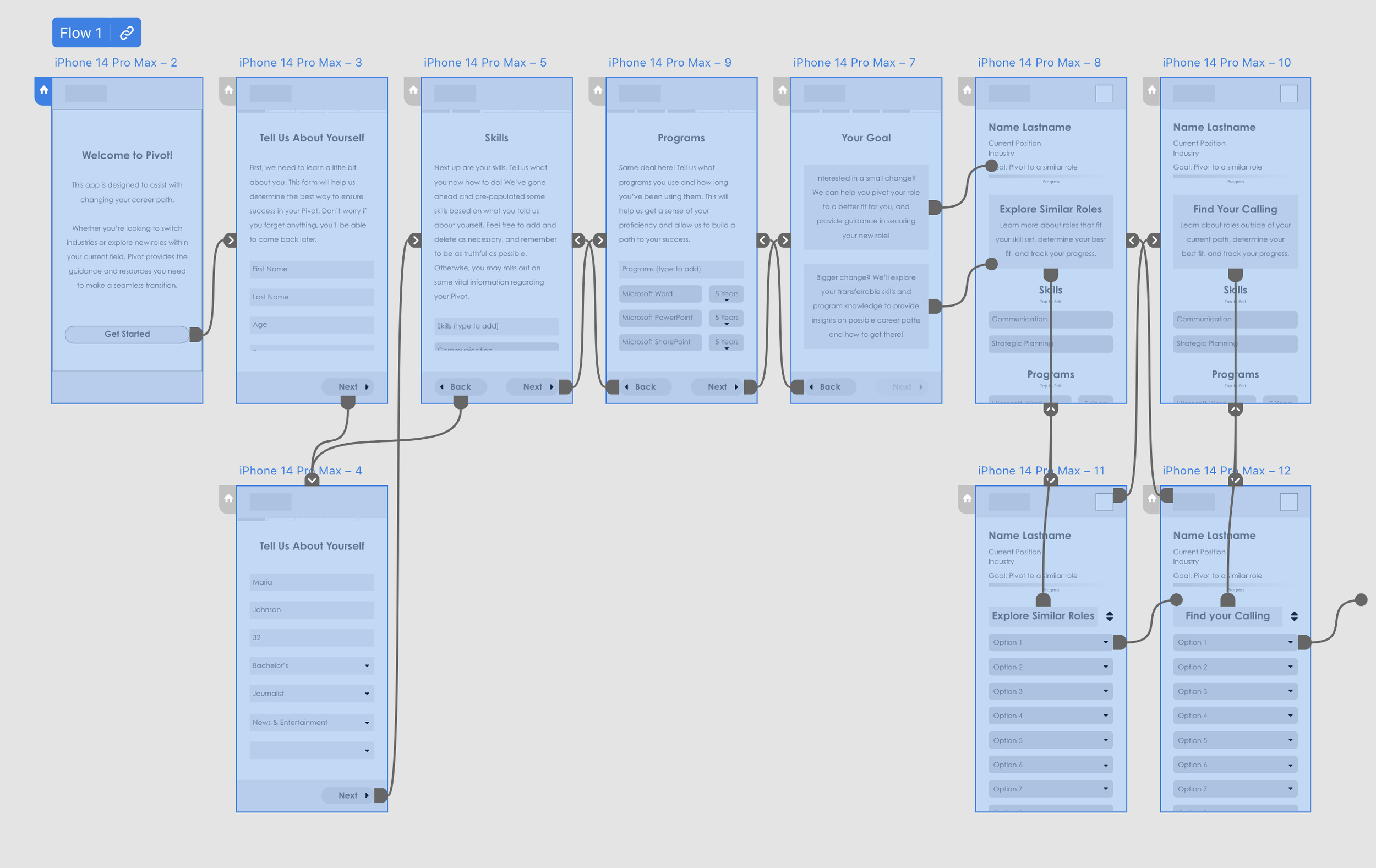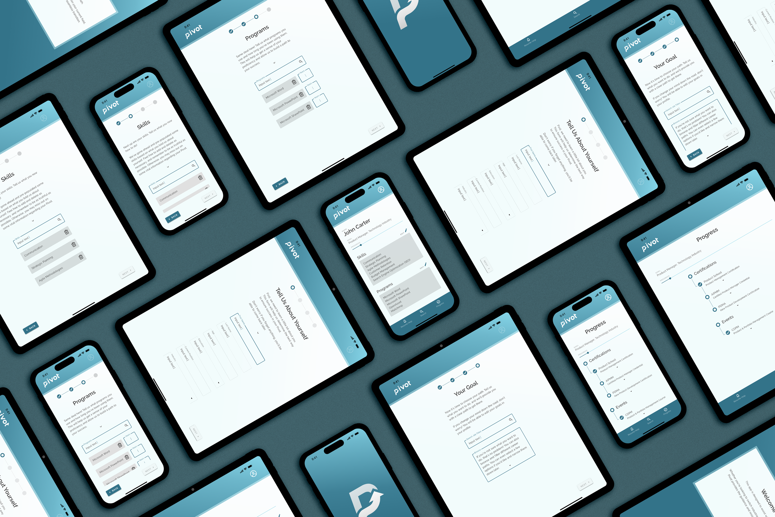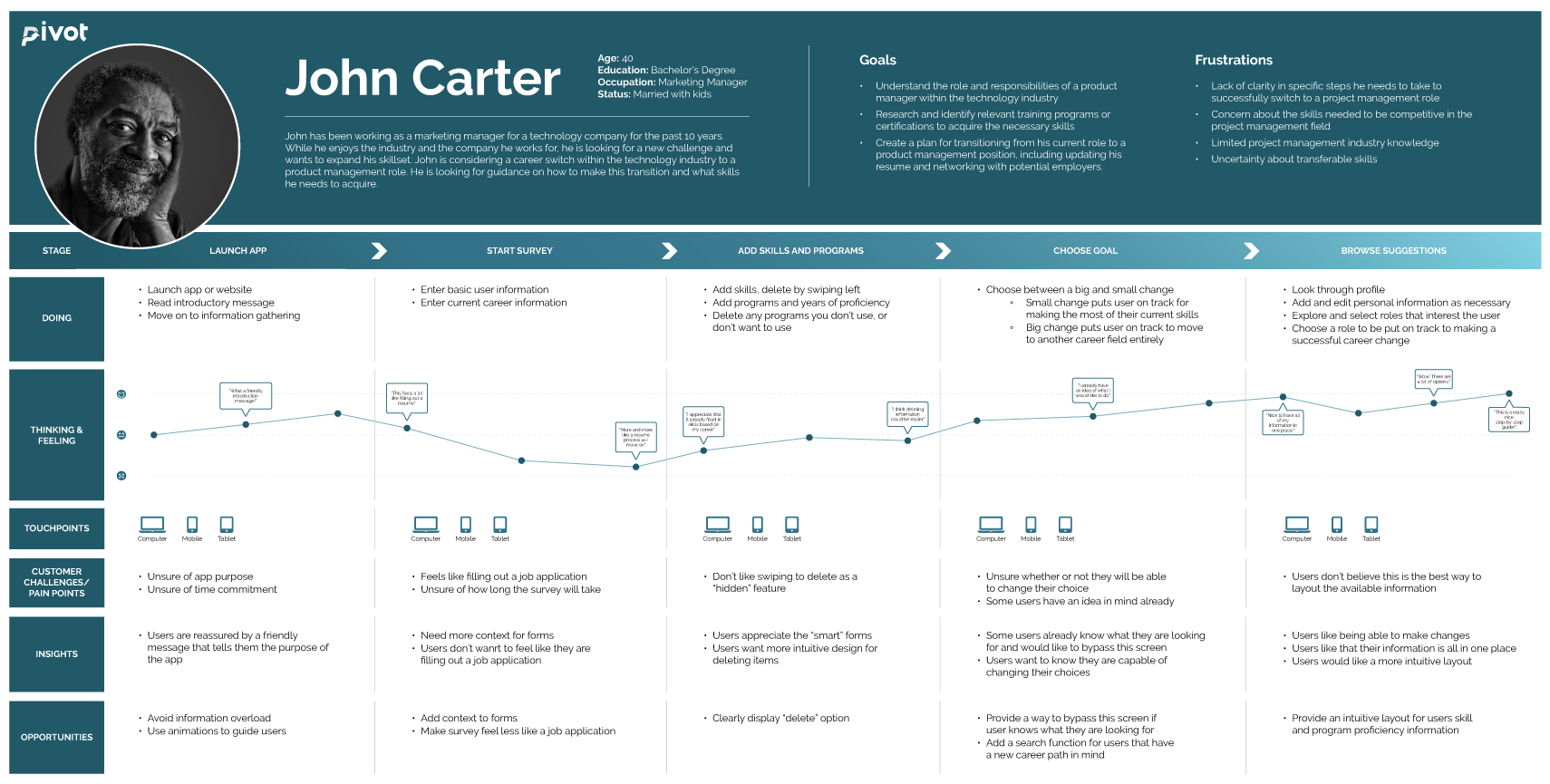 As the lead UX designer and researcher for Pivot, I was responsible for conducting interviews, creating personas, journey mapping, conducting competitive audits, establishing branding, low and high-fidelity prototyping, identifying patterns and insights, conducting usability studies, and accounting for accessibility.
