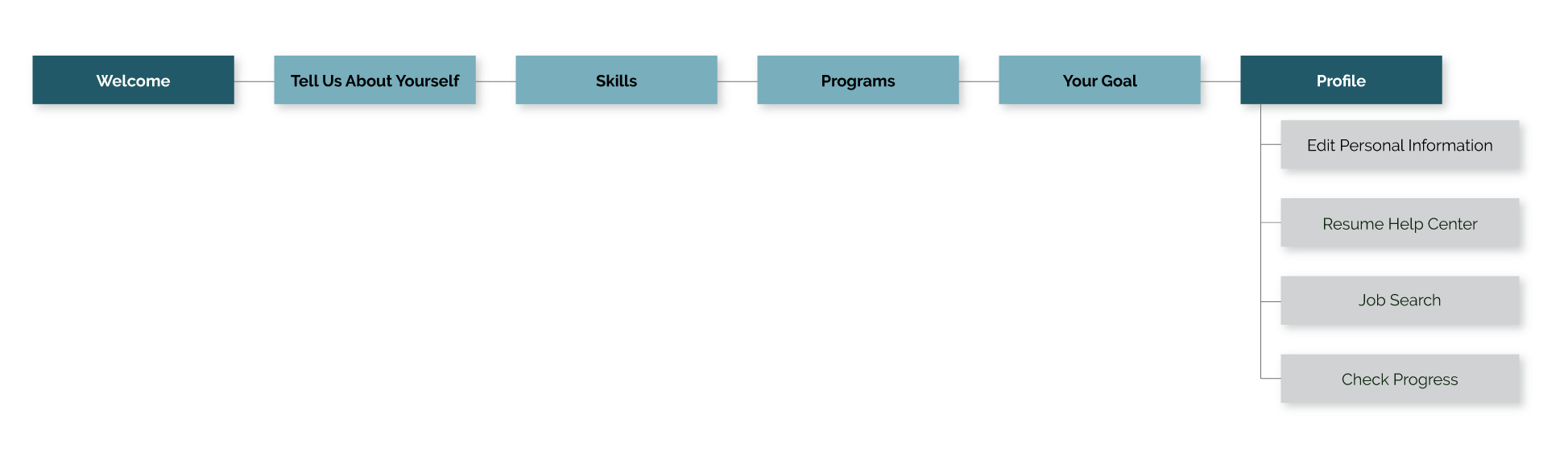 I determined that a linear structure was best suited for the initial survey forms, and a standard hierarchical structure is introduced once the users have completed their profiles.