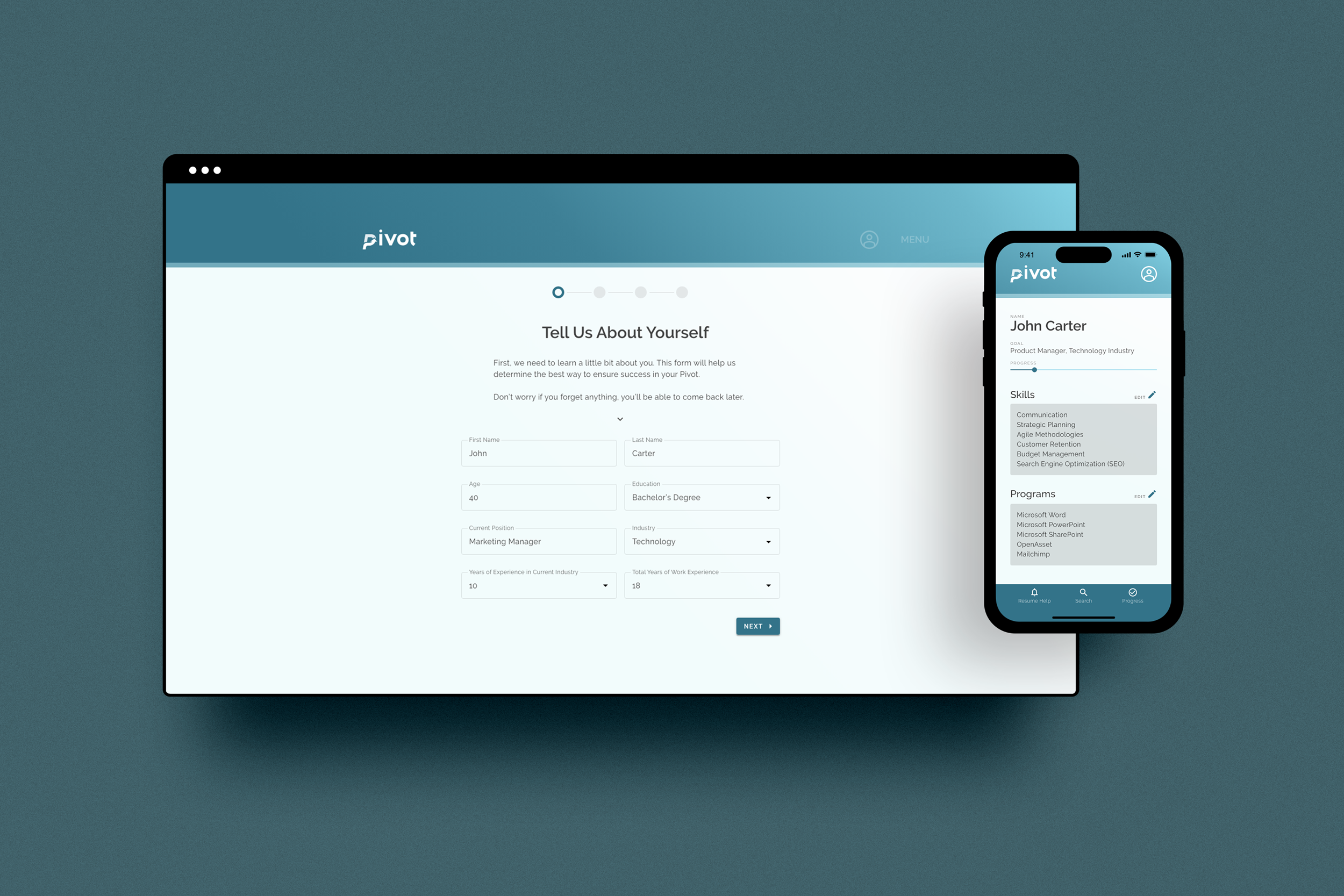 The desktop version of the Pivot wireframes offer a maintain the same straightforward reading and tab order that are present in the mobile design.